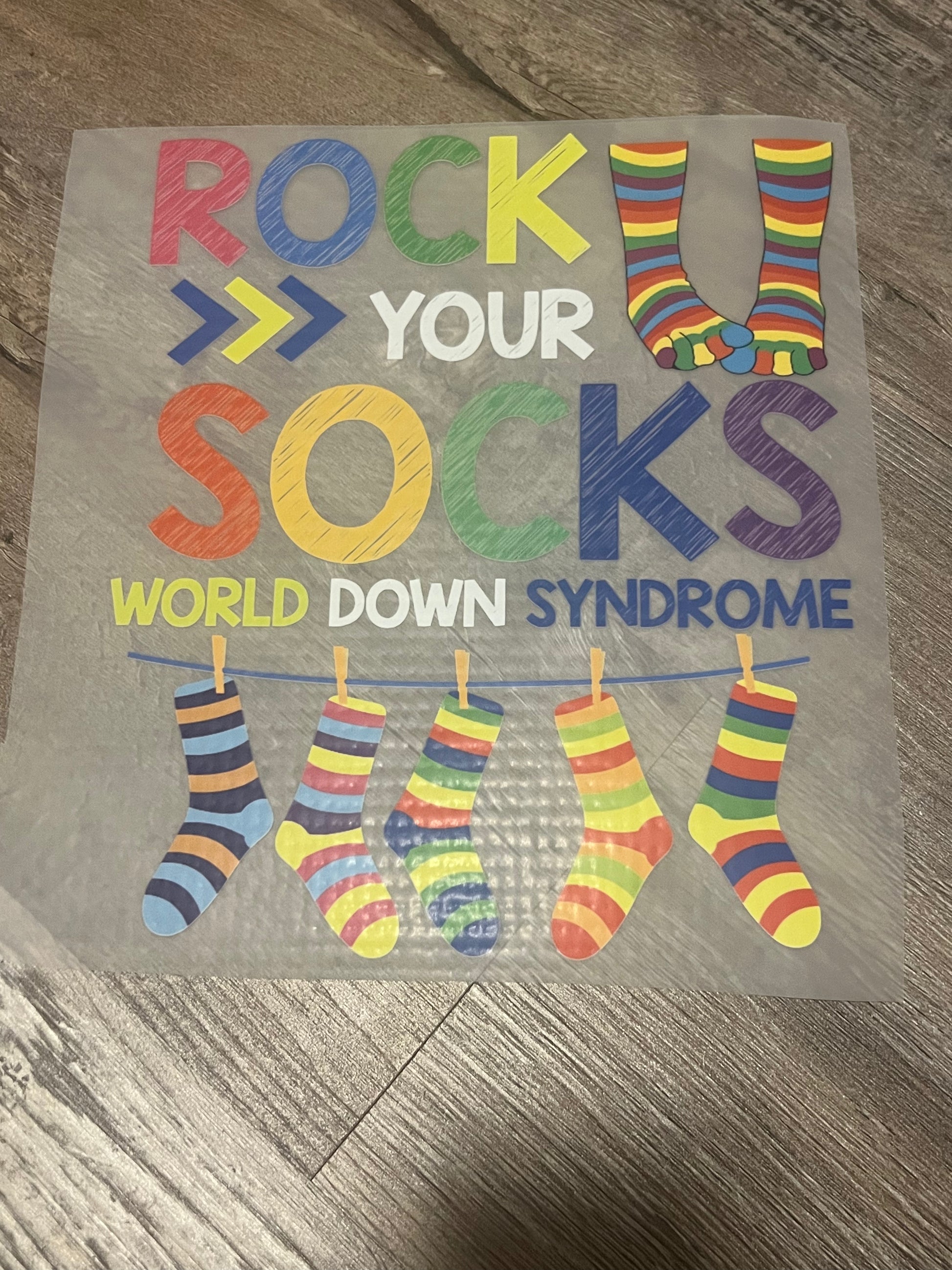 Direct to film, transfer rock your socks world down syndrome, multiple colors